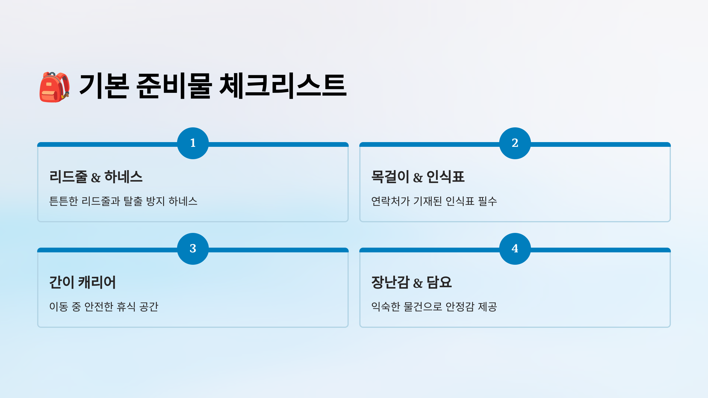 강아지는 평소 익숙한 환경 안에서 생활하는 동물이기 때문에, 외출이나 여행 같은 비일상적인 활동은 큰 스트레스를 줄 수 있어요. 그렇기 때문에 사전에 충분한 준비를 해주는 것이 반려견의 안정감과 건강을 지키는 핵심이에요. 특히 장시간 이동하거나 낯선 공간에서 머물러야 할 경우, 준비물의 유무가 강아지의 스트레스를 줄이는 데 직접적인 영향을 준답니다.