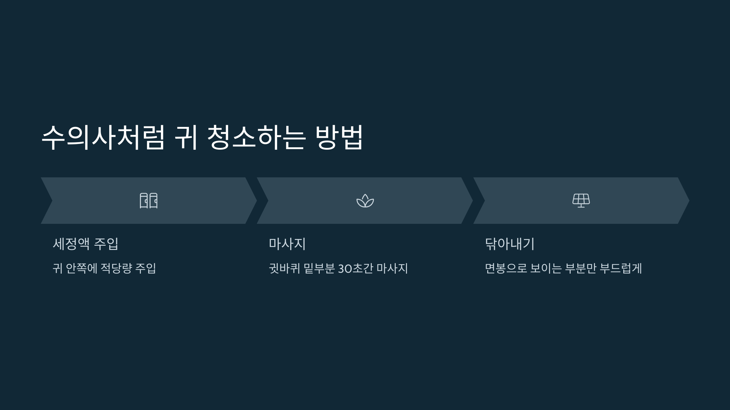 귀 세정제를 귀 입구에 살짝 넣은 뒤, 귀 바깥쪽을 부드럽게 마사지해줘요. ‘촉촉’ 소리가 날 정도로 충분히 흔들어주는 게 포인트예요. 이 과정은 귀 속 이물질을 부드럽게 풀어주는 데 중요해요.