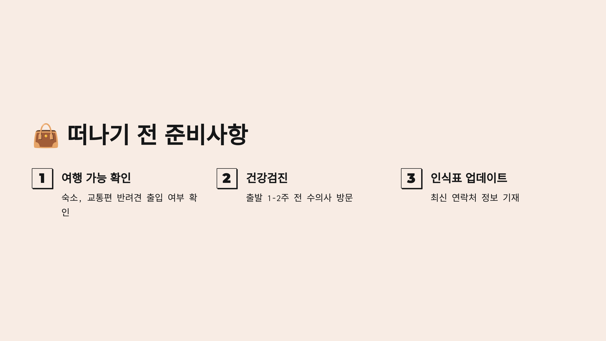 해외 여행의 경우는 조금 더 까다로워요. 반려동물 동반 기준이 나라별로 다르기 때문에, 미리 입국 요건과 검역 절차를 꼼꼼히 확인해야 해요. 일본, 프랑스, 독일 등은 비교적 반려동물에 관대한 편이지만 사전 준비는 필수랍니다. 🌍