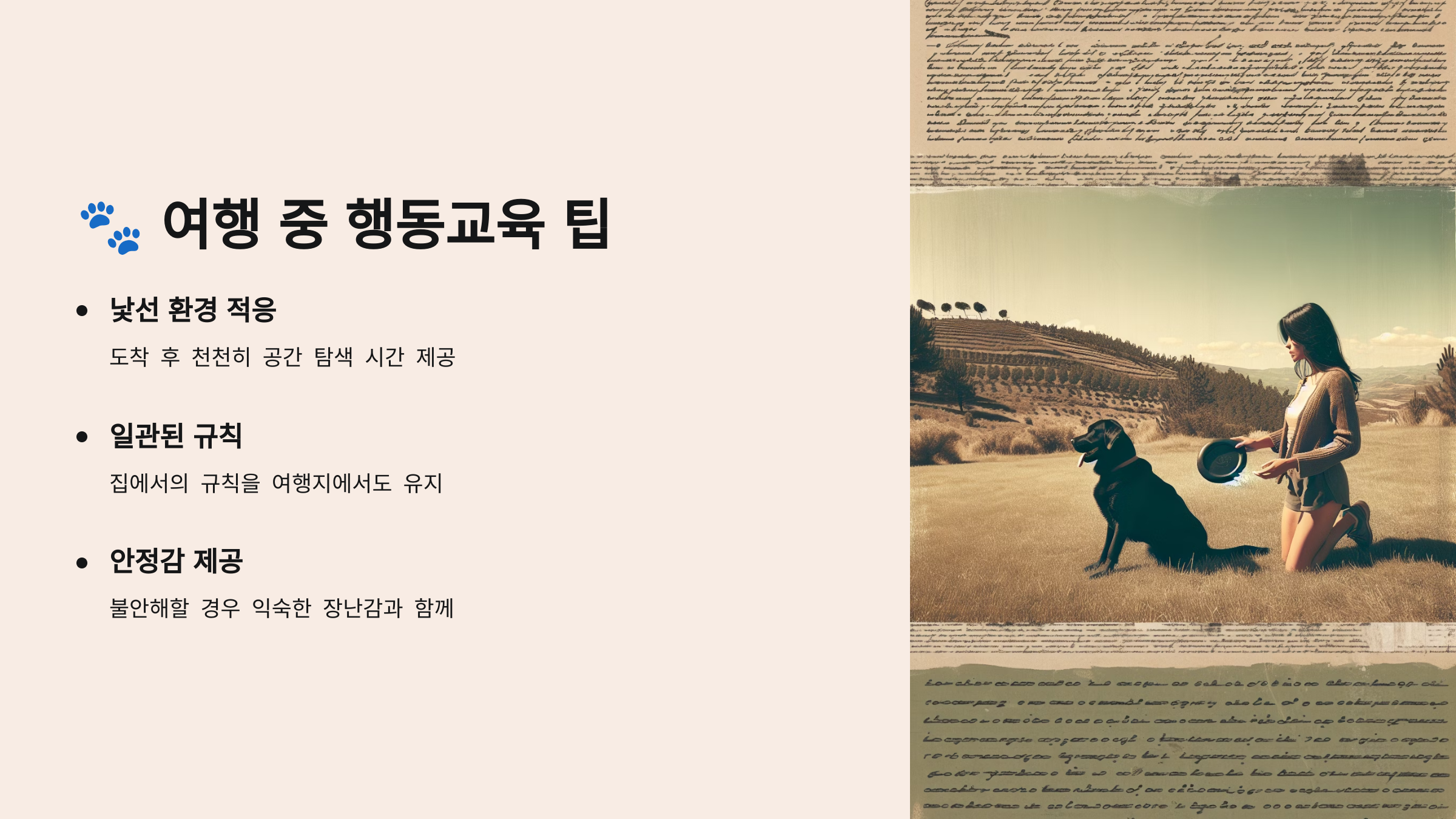 여행을 가면 강아지도 들뜨고 낯선 환경에 긴장할 수 있어요. 그래서 평소보다 더 집중적인 행동관리가 필요하답니다. 산책 중 갑자기 짖거나 사람 많은 곳에서 겁을 먹을 수 있기 때문에 간단한 훈련을 사전에 연습해두면 큰 도움이 돼요. 🎯