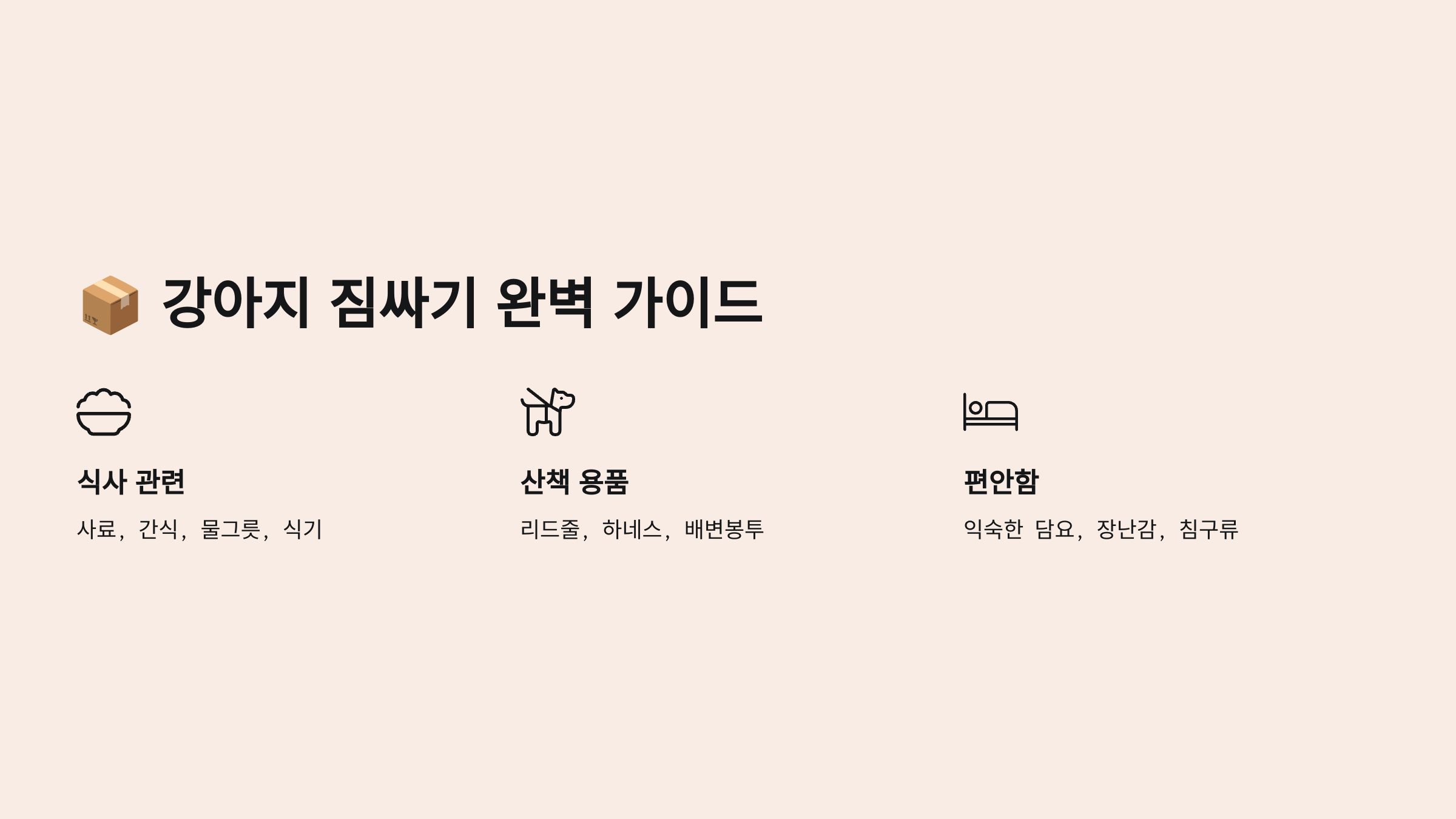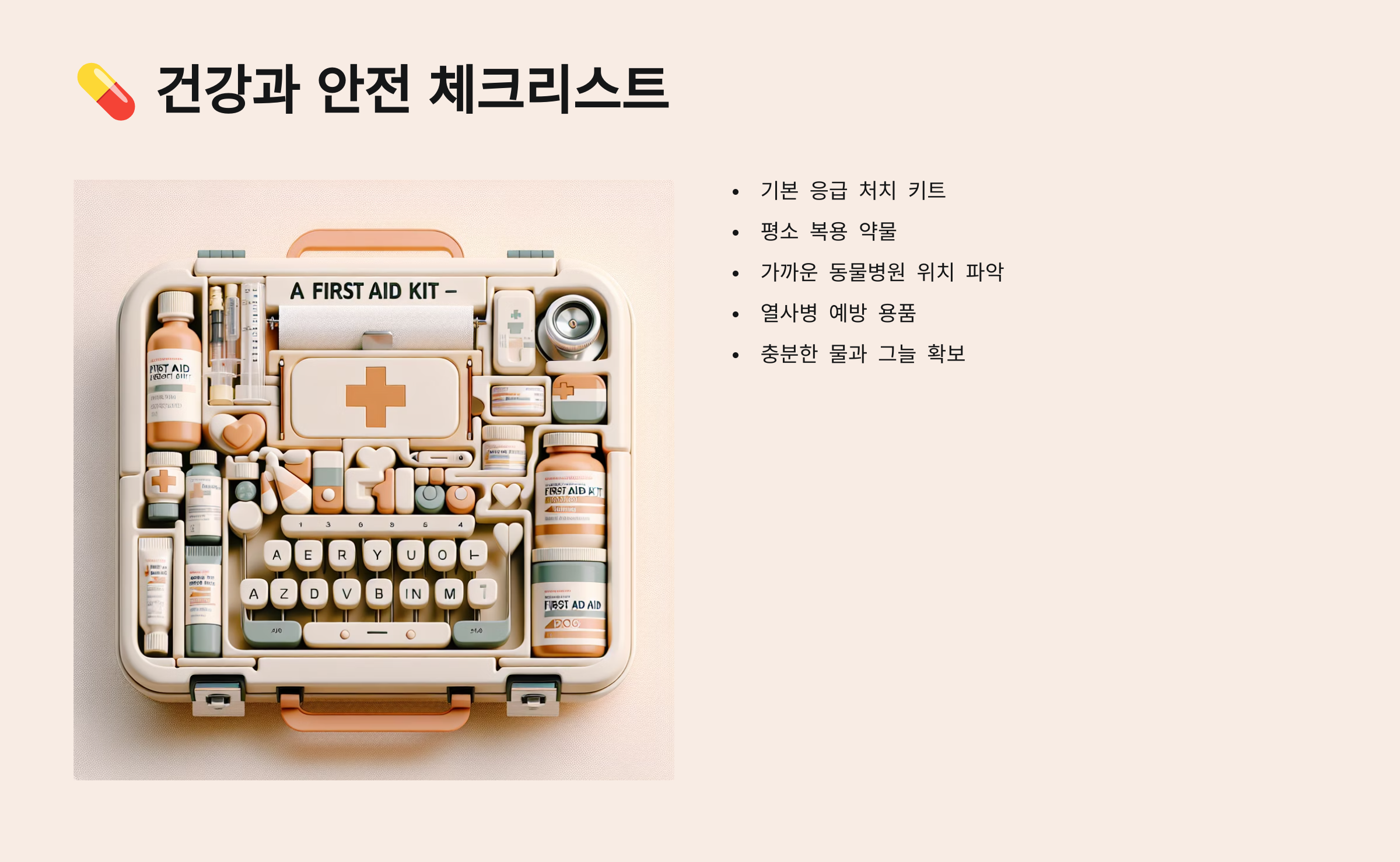 준비물이 많아 보여도 하나하나 체크해두면 마음이 한결 편안해진답니다. 이렇게 철저히 준비하면 강아지도 편안하고 즐거운 시간을 보낼 수 있어요!