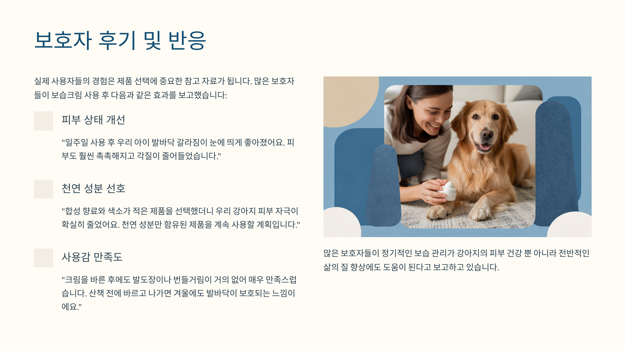 또 어떤 분은 "피부가 자주 벗겨지고 비듬이 생겼던 아이에게 천연 성분 보습크림을 꾸준히 발랐더니, 딱 일주일 만에 눈에 띄게 좋아졌어요. 털도 다시 자라고 있어요"라고 남겼답니다. 이런 경험은 같은 고민을 가진 보호자에게 큰 힘이 돼요.