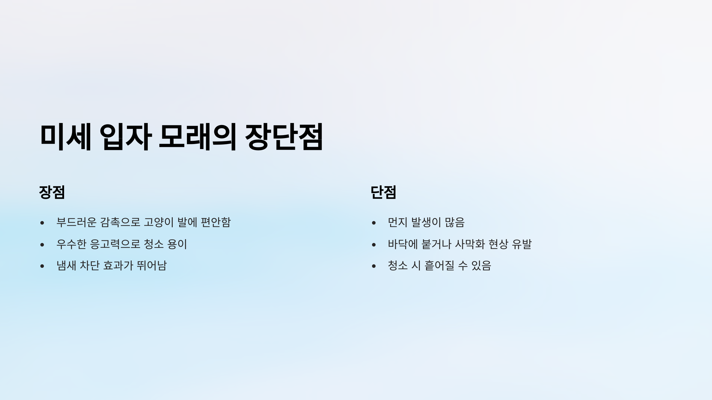 하지만 미세 입자 모래는 단점도 있어요. 입자가 작다 보니 사용 중 먼지가 많이 날릴 수 있고, 고양이가 모래를 파낼 때 집 안 곳곳으로 쉽게 흩날릴 수 있어요. 고양이가 모래를 핥거나 털에 묻어오는 경우도 가끔 있답니다. 그래서 호흡기가 예민한 고양이라면 주의가 필요해요.