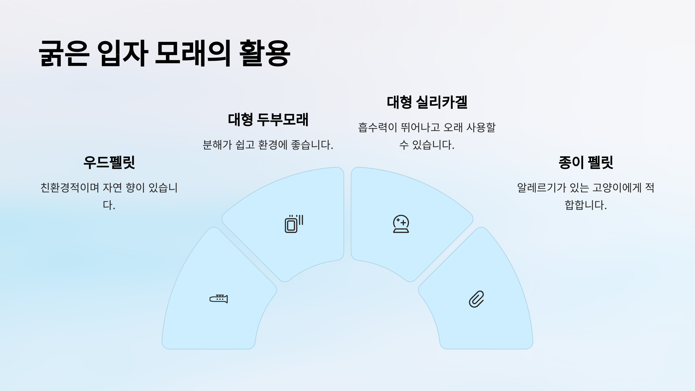 | 굵은 입자 | 재활용 종이, 우드펠릿 | 먼지 적고 친환경 |