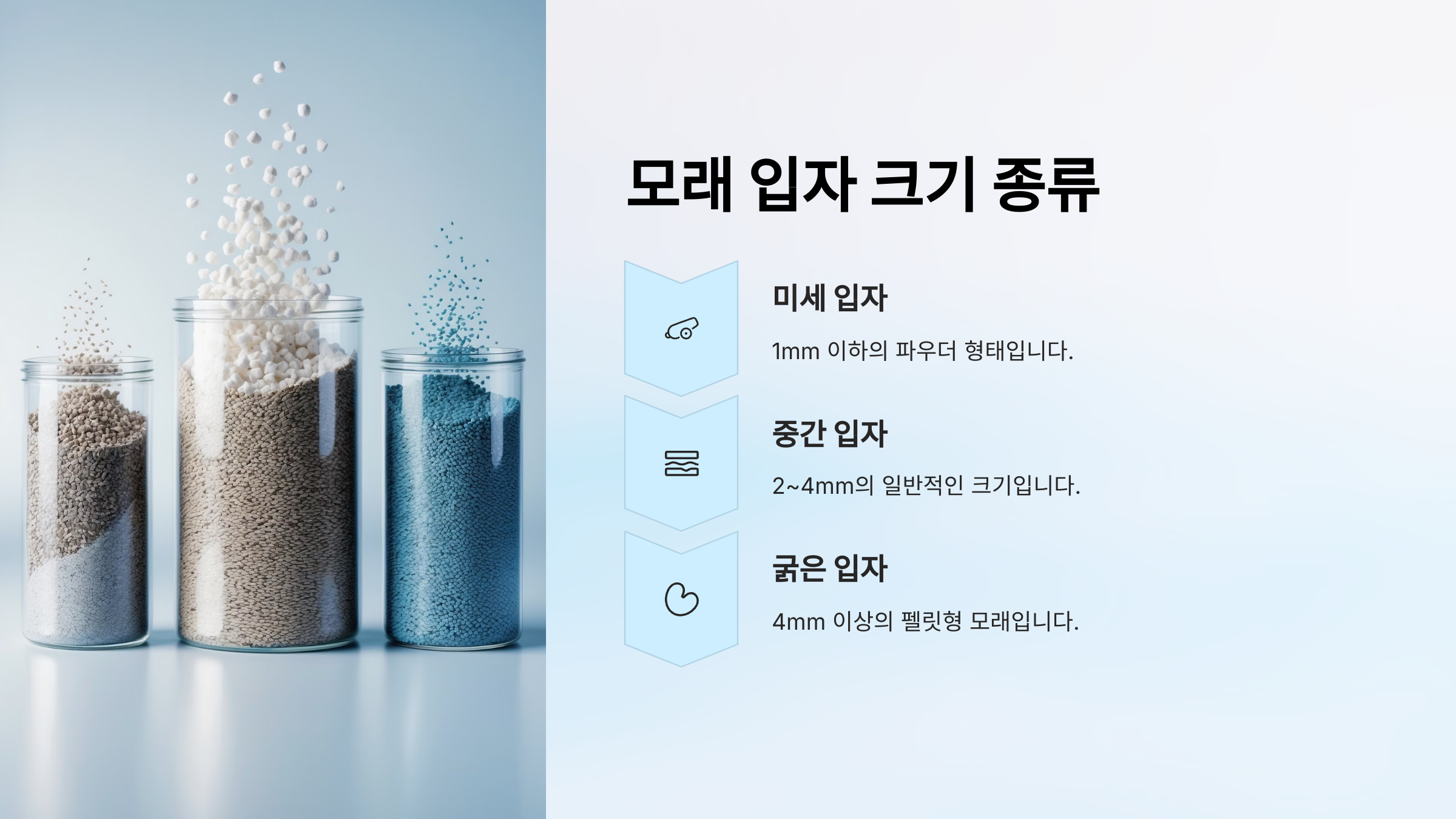 최근에는 미세 입자 모래, 중간 입자 모래, 굵은 입자 모래까지 종류가 다양해졌어요. 각각의 입자 크기는 어떤 상황에 유리한지, 실제 사용 후기를 살펴보면 도움이 돼요.