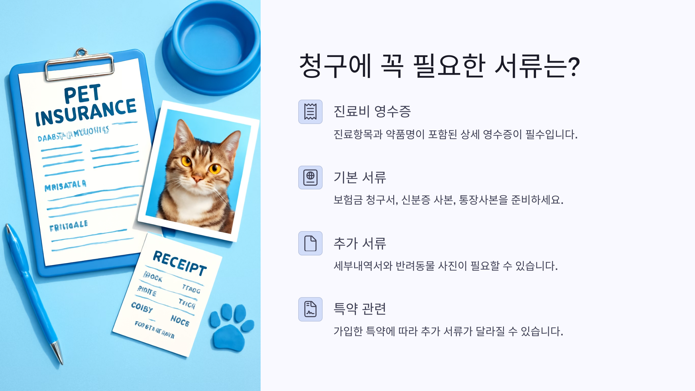 고양이 치료비를 보험으로 청구하려면 그냥 영수증만 가지고는 부족해요. 보험사에서 요구하는 서류가 따로 있기 때문에 처음부터 꼼꼼하게 준비하는 게 중요해요.