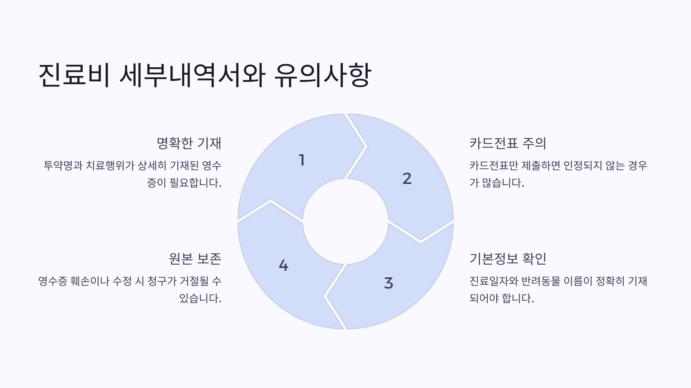 고양이 이름, 등록번호, 진료일자, 병명, 치료내용, 금액 등 모든 정보가 명확하게 적혀 있어야 하고, 병원 원장 도장이나 서명도 빠지면 안 돼요. 보험사 입장에서는 이 모든 요소가 신뢰성과 정당성을 보여주는 기준이 되거든요.