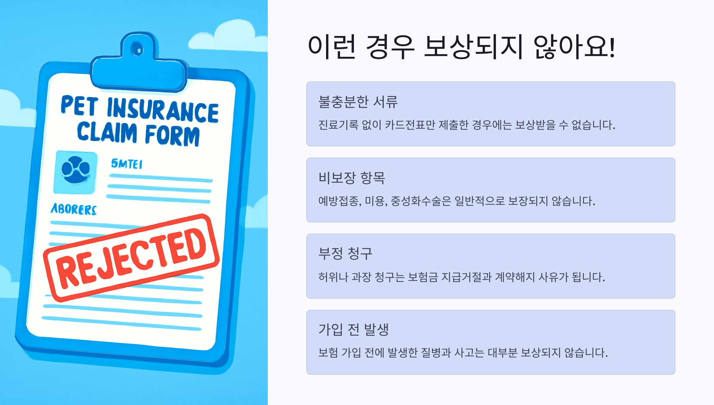 네 번째는 약관상 ‘면책질환’이에요. 일부 보험사는 슬개골탈구, 구강질환, 피부염 등 특정 질환을 원칙적으로 보장하지 않아요. 이는 약관에 명시된 항목으로, 가입할 때는 보장 범위를 꼭 읽어보고 선택해야 해요.
