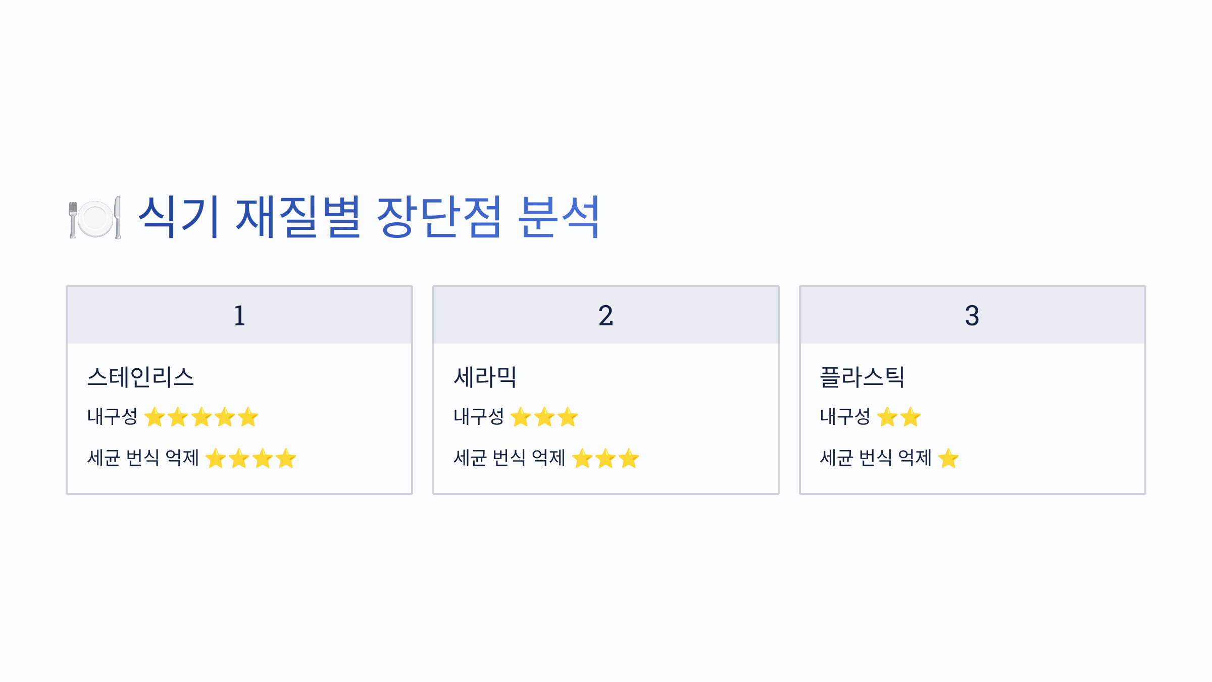 스테인리스 식기는 전문가들이 가장 많이 추천하는 재질이에요. 표면이 매끄러워 세균이 달라붙을 틈이 거의 없고, 흠집이 생기지 않아 위생적인 사용이 가능해요. 열탕 소독도 문제없고 내구성도 뛰어나서 오래 쓸 수 있답니다.