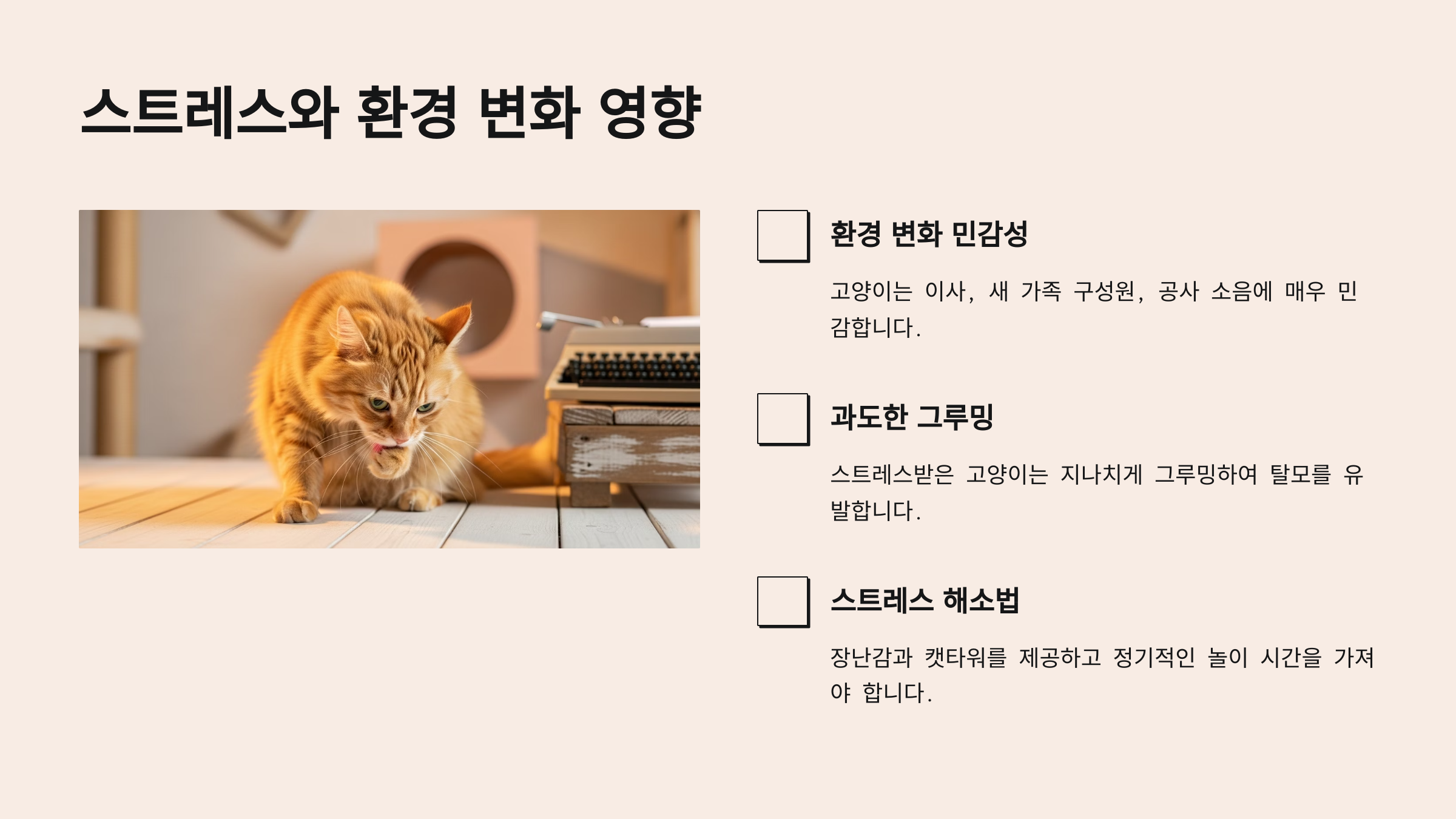| 스트레스 요인 | 행동 변화 | 털 빠짐 여부 |