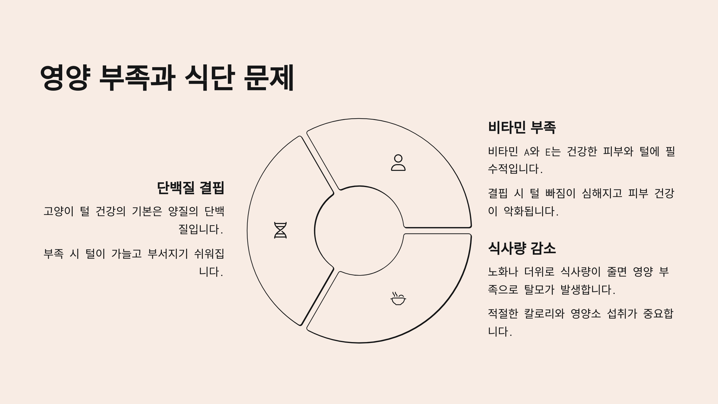 만약 고양이의 식욕이 줄고, 체중도 감소하면서 털 빠짐이 심해졌다면 단순한 털갈이가 아닌 영양학적 문제를 의심해볼 필요가 있어요. 이럴 땐 식단 교정이 꼭 필요하답니다.