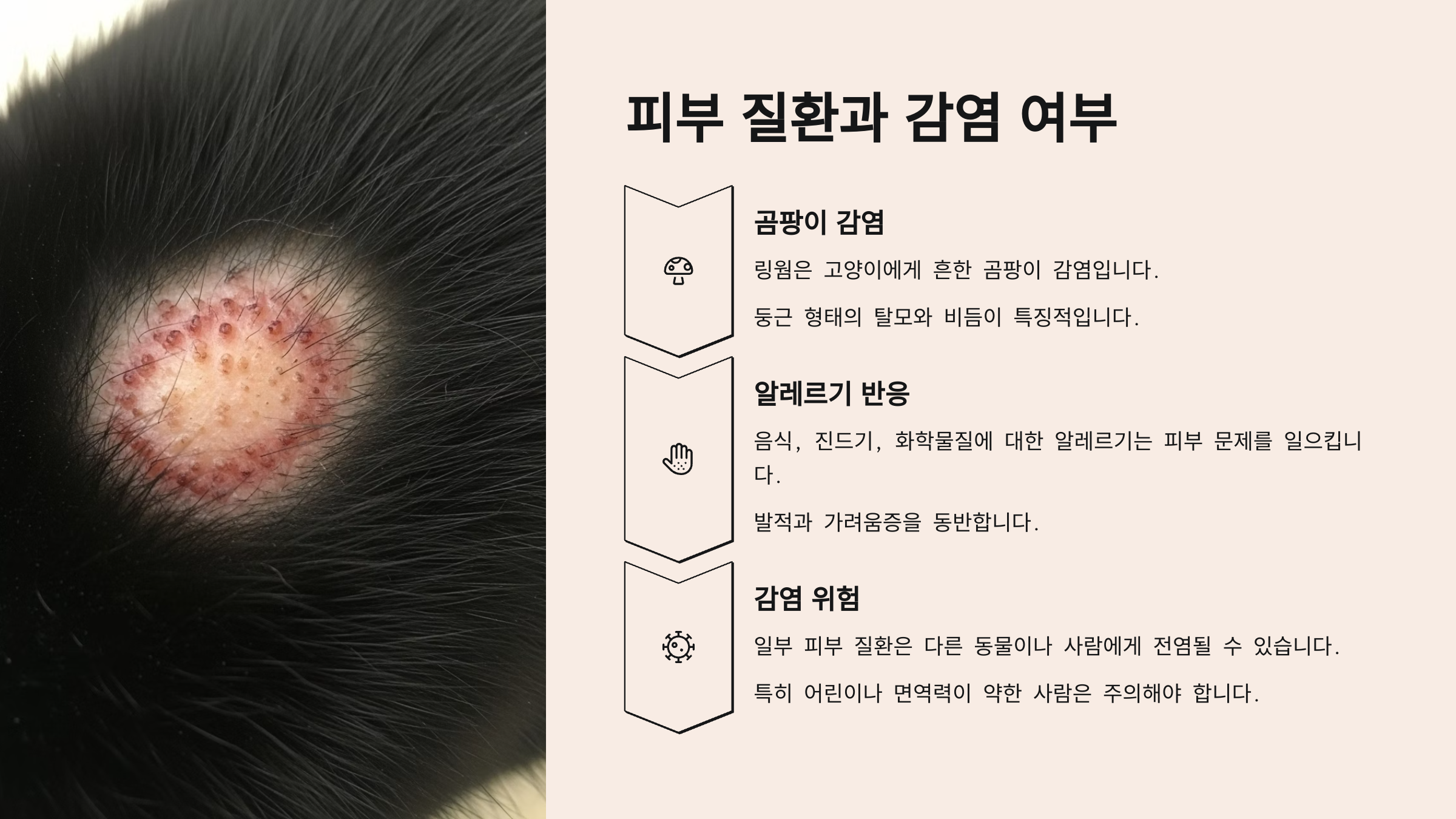 고양이에게 가장 흔한 피부 문제는 곰팡이성 피부염(백선), 진드기 감염, 알레르기성 피부염이에요. 이런 질환은 빠르게 확산되기 때문에 초기에 발견해 조치하는 게 중요해요.