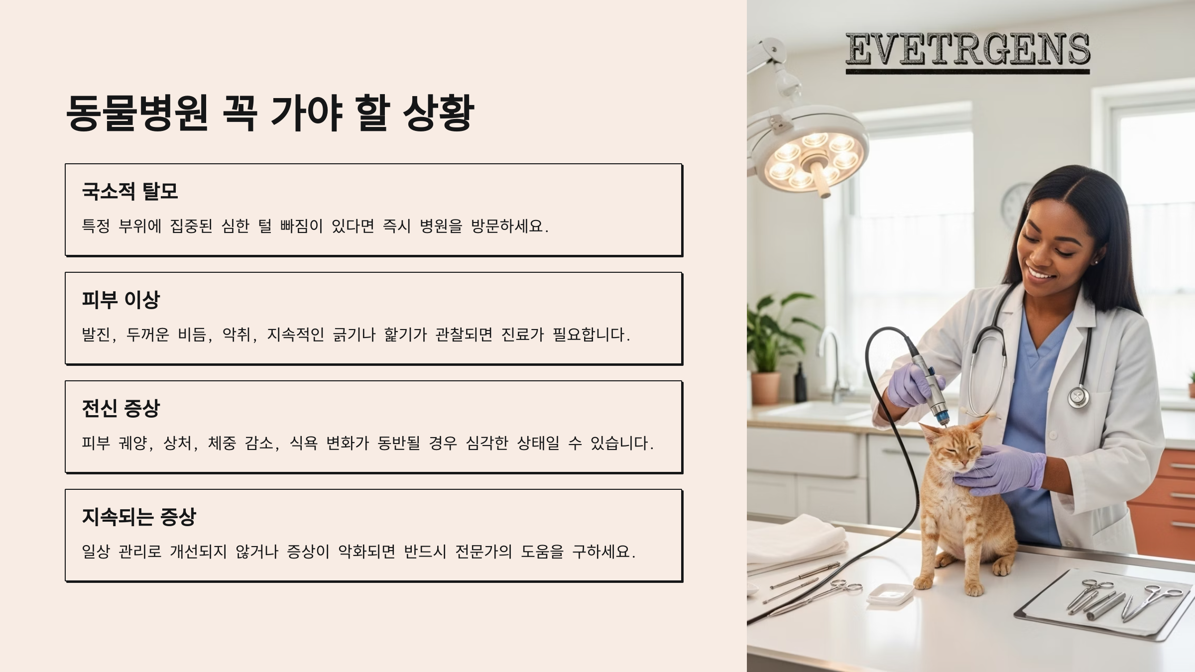 고양이가 전체적으로 무기력하고, 털에 윤기가 없고, 이상하게 특정 부위만 집중적으로 빠진다면 단순한 환경문제가 아니라 내과적 질병 신호일 수 있어요. 전문적인 진단이 필요하답니다.