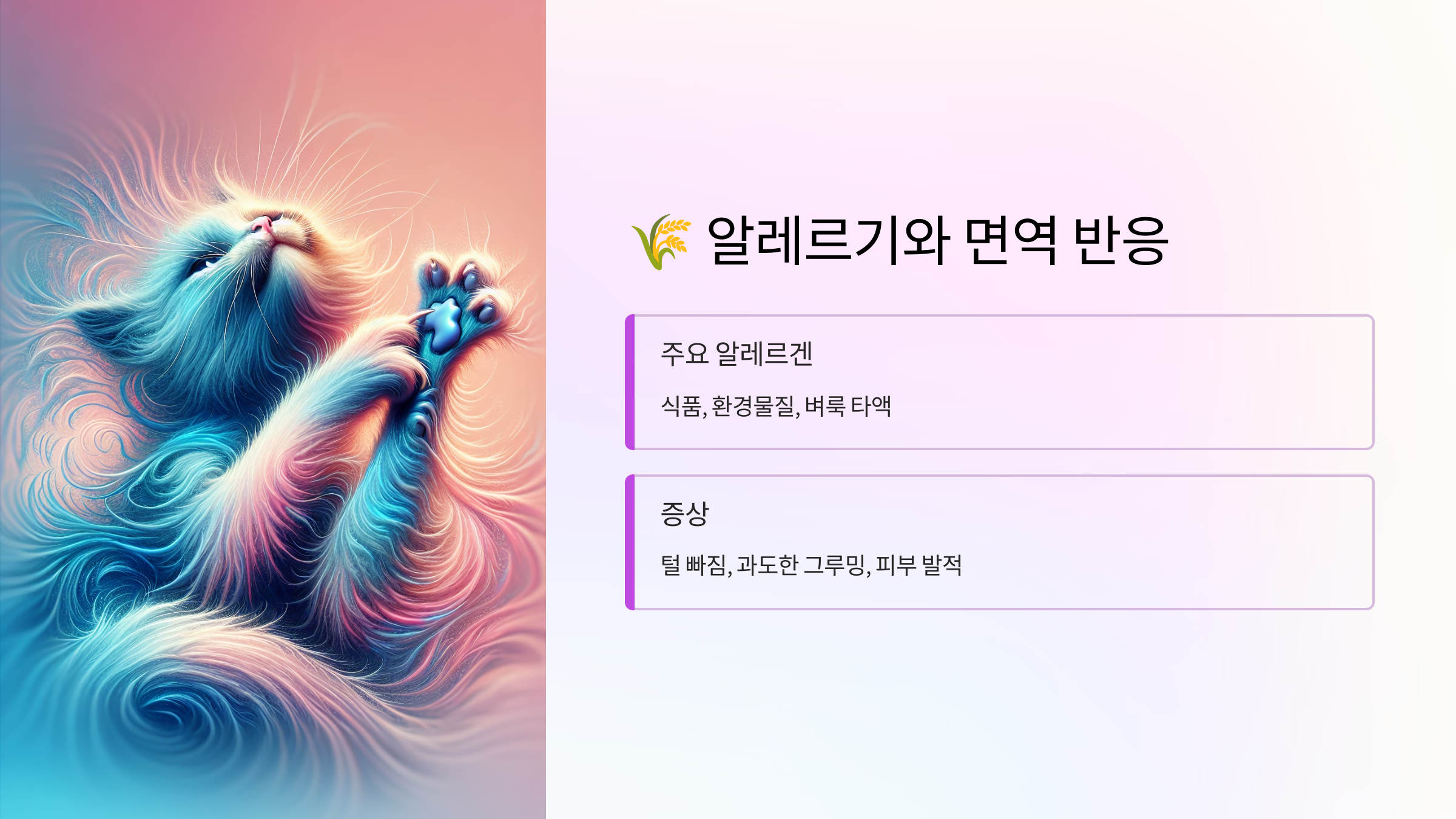 또한, 스트레스성 자가 그루밍이나 식이 알레르기, 환경 변화도 털 빠짐을 유발할 수 있어요. 특히 고양이는 스트레스가 외부로 드러나기 어렵기 때문에 행동 변화까지 주의 깊게 살펴야 해요.