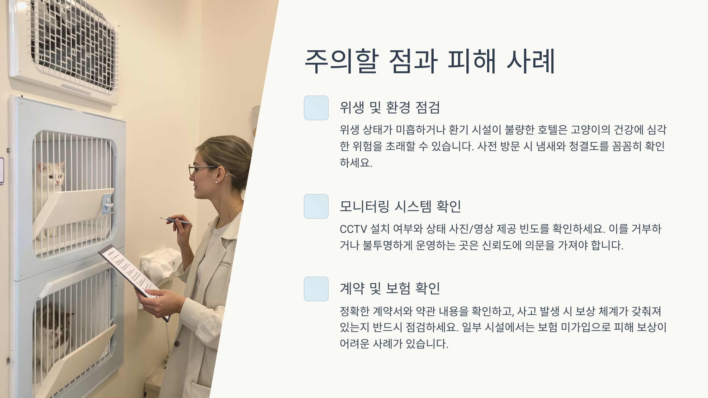 정해진 시간 외에는 직원이 없는 ‘무인 운영 호텔’도 피해 사례가 있어요. 고양이가 아파도 즉시 대응이 어렵고, 이상 행동을 놓치기 쉬워요. 실제로 어떤 집사는 “호텔 측에서 고양이 상태 이상을 말해주지 않아 다음날 병원에 바로 갔다”는 이야기도 남겼어요.