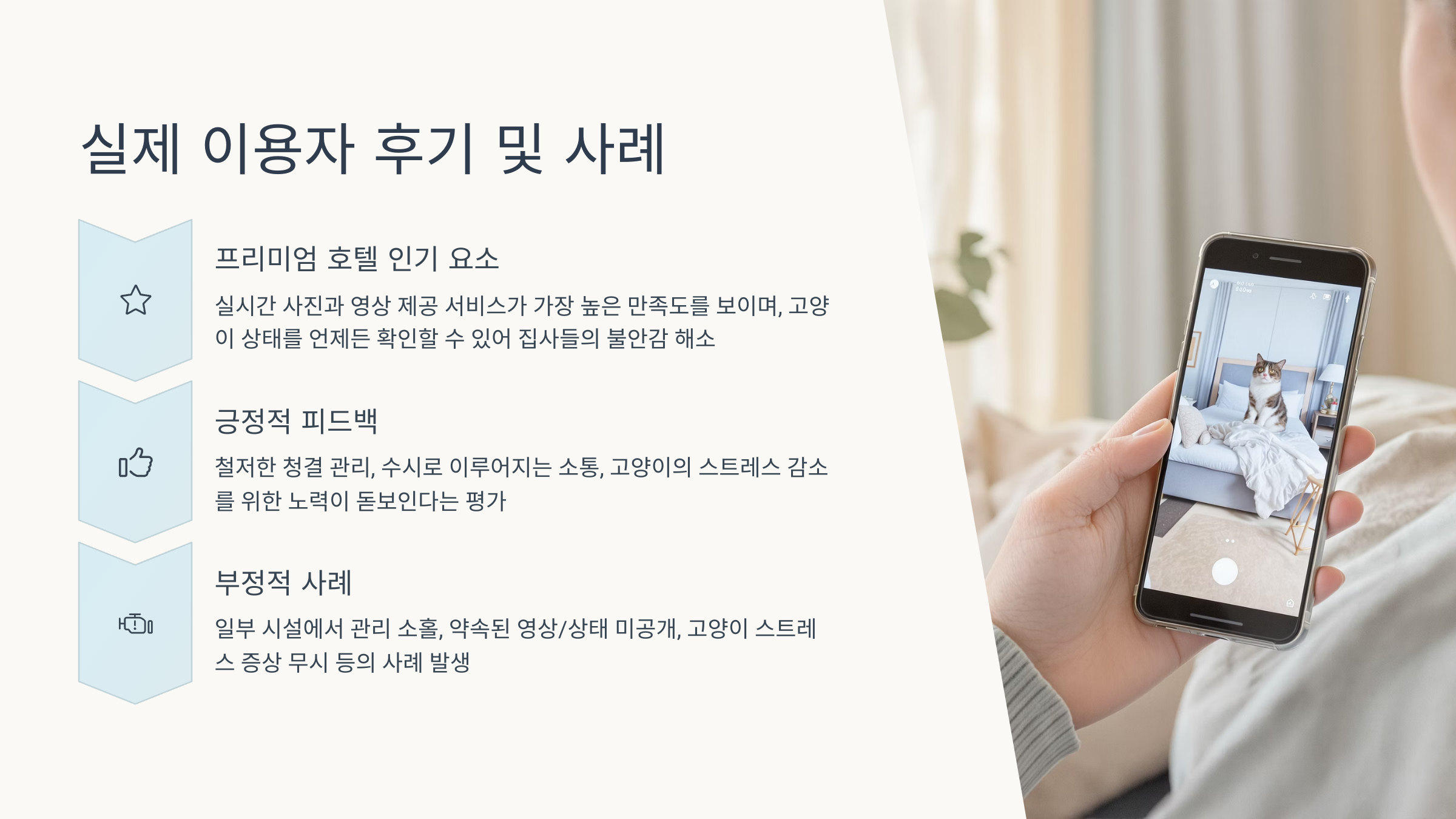 아쉬운 후기도 있어요. 경기 지역의 한 호텔에서는 “첫날은 잘 지낸 것 같았지만 CCTV에서 고양이가 계속 구석에 웅크려 있는 모습이 보여서 마음이 아팠다”는 경험담도 있었어요. 결국 중간에 조기 퇴실하고 집에 데려왔다는 사례도 존재해요.