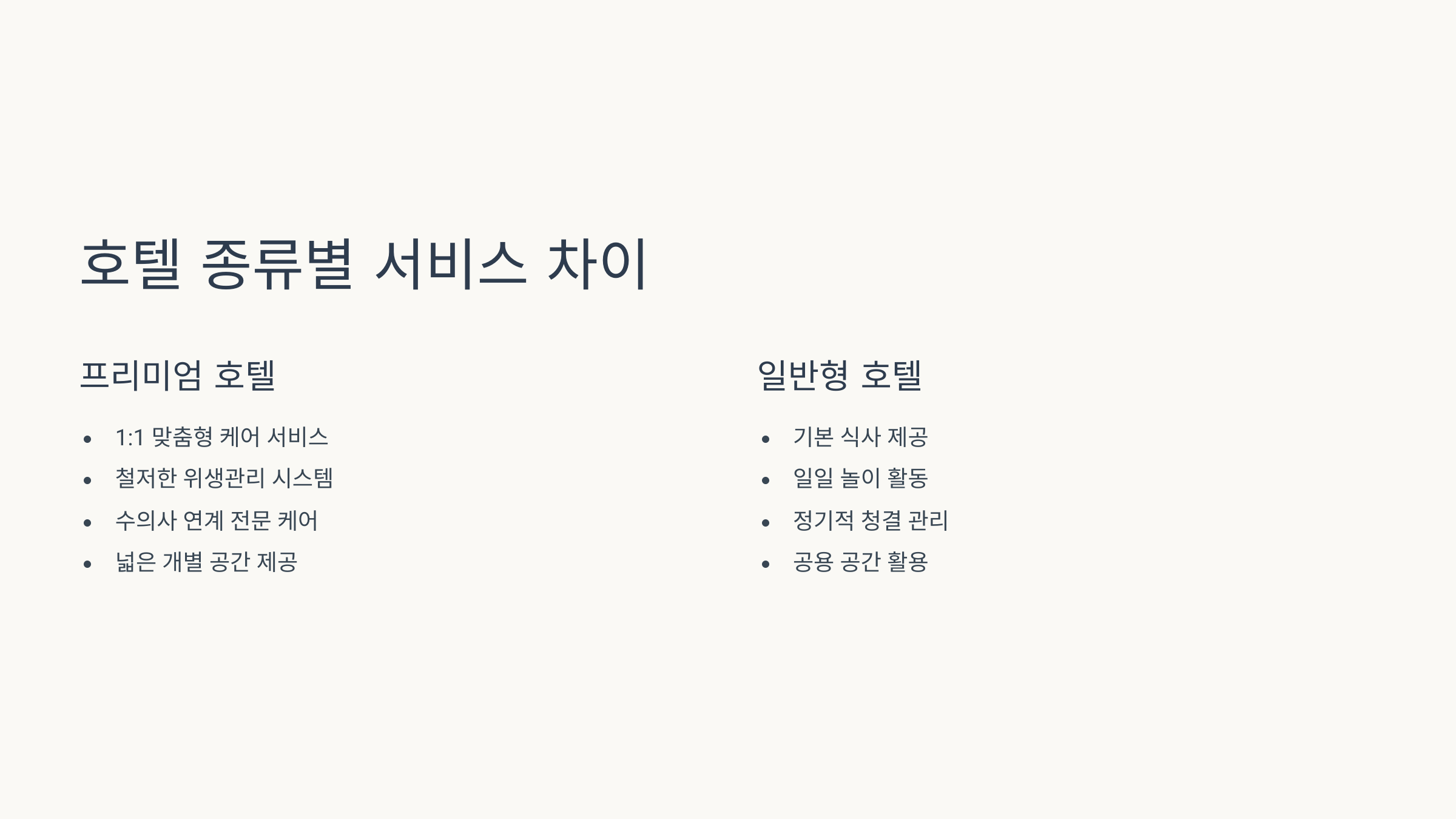 | 프리미엄 호텔 (서울) | 고급 시설, CCTV, 전담 집사 | 가격 부담 큼 |