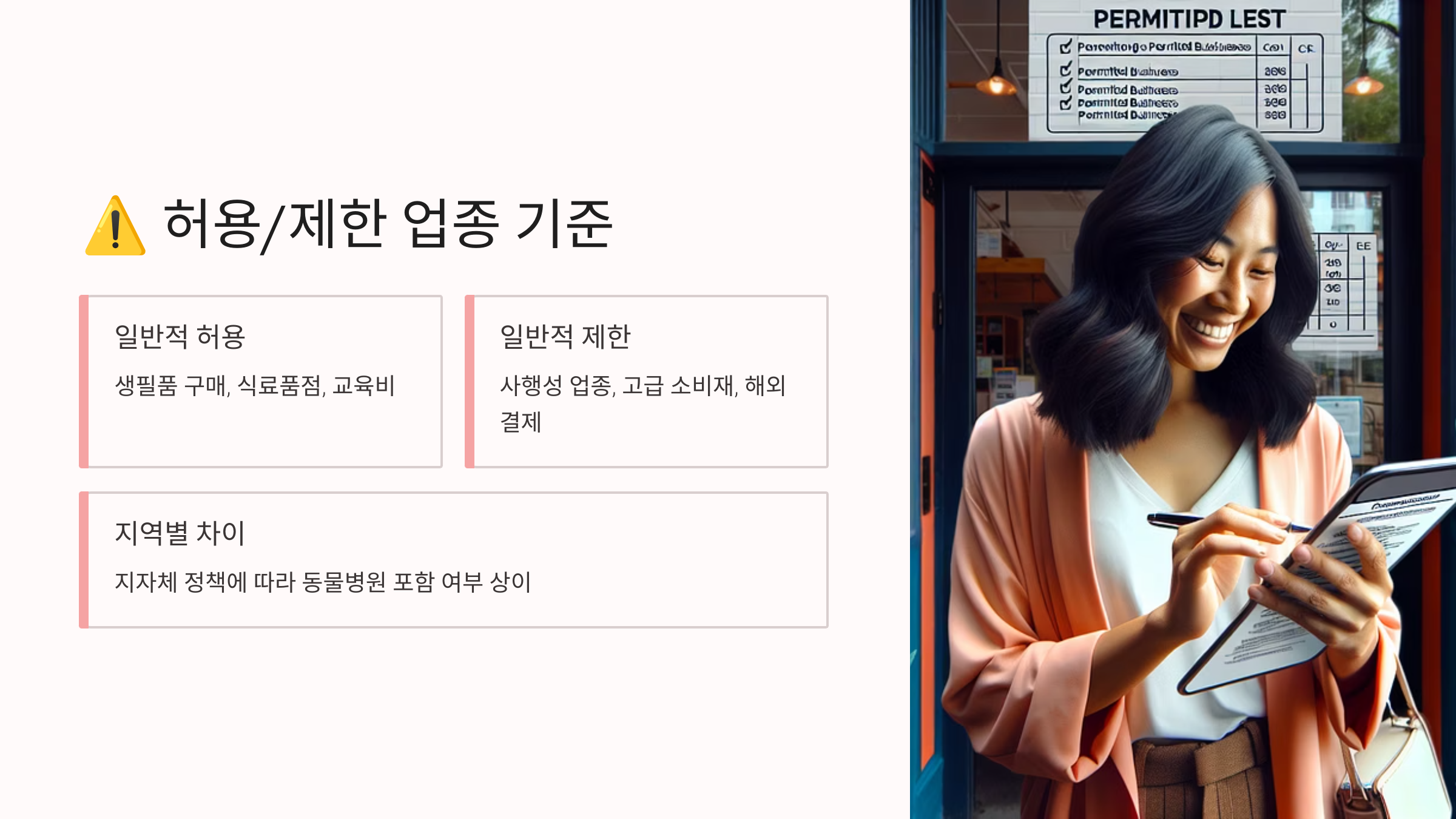 반대로 사용이 제한되는 대표적인 업종에는 백화점, 대형마트, 유흥업소, 온라인 쇼핑몰, 카지노, 골프장, 귀금속 판매점, 면세점, 렌터카, 보험, 통신사 직영점, 프랜차이즈 직영 매장 등이 있어요. 이들은 대체로 대기업 또는 생활필수와 무관한 소비처로 간주돼요.