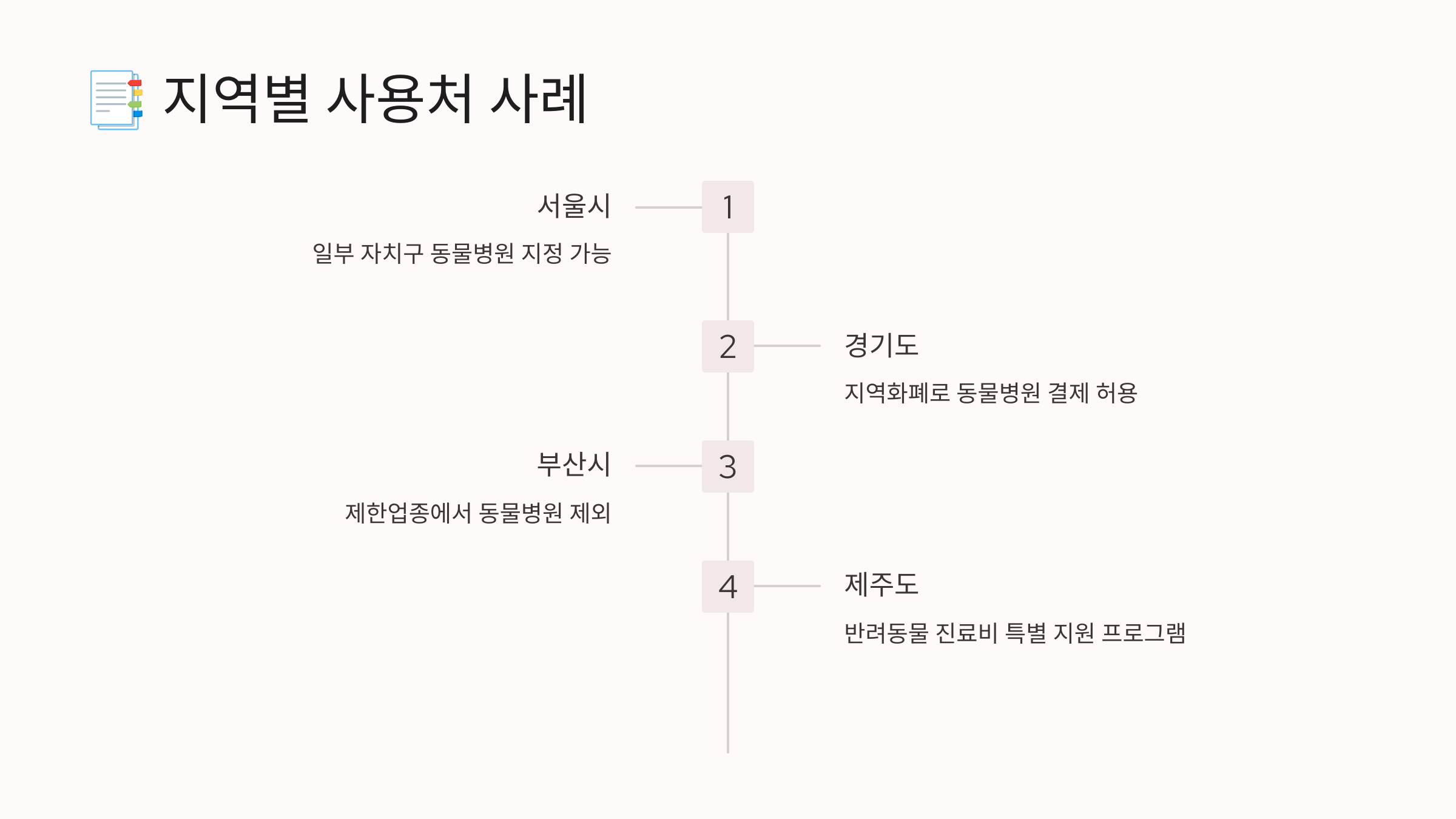 경기도 고양시의 경우 2024년 말까지는 동물병원 사용이 제한됐지만, 2025년부터는 진료 항목에 한해 조건부 허용되기 시작했어요. 이때 중요한 조건은, 결제 항목이 ‘진료’로 명확히 구분돼야 한다는 거예요. 미용, 용품구매, 호텔링 서비스 등은 여전히 불가하죠.