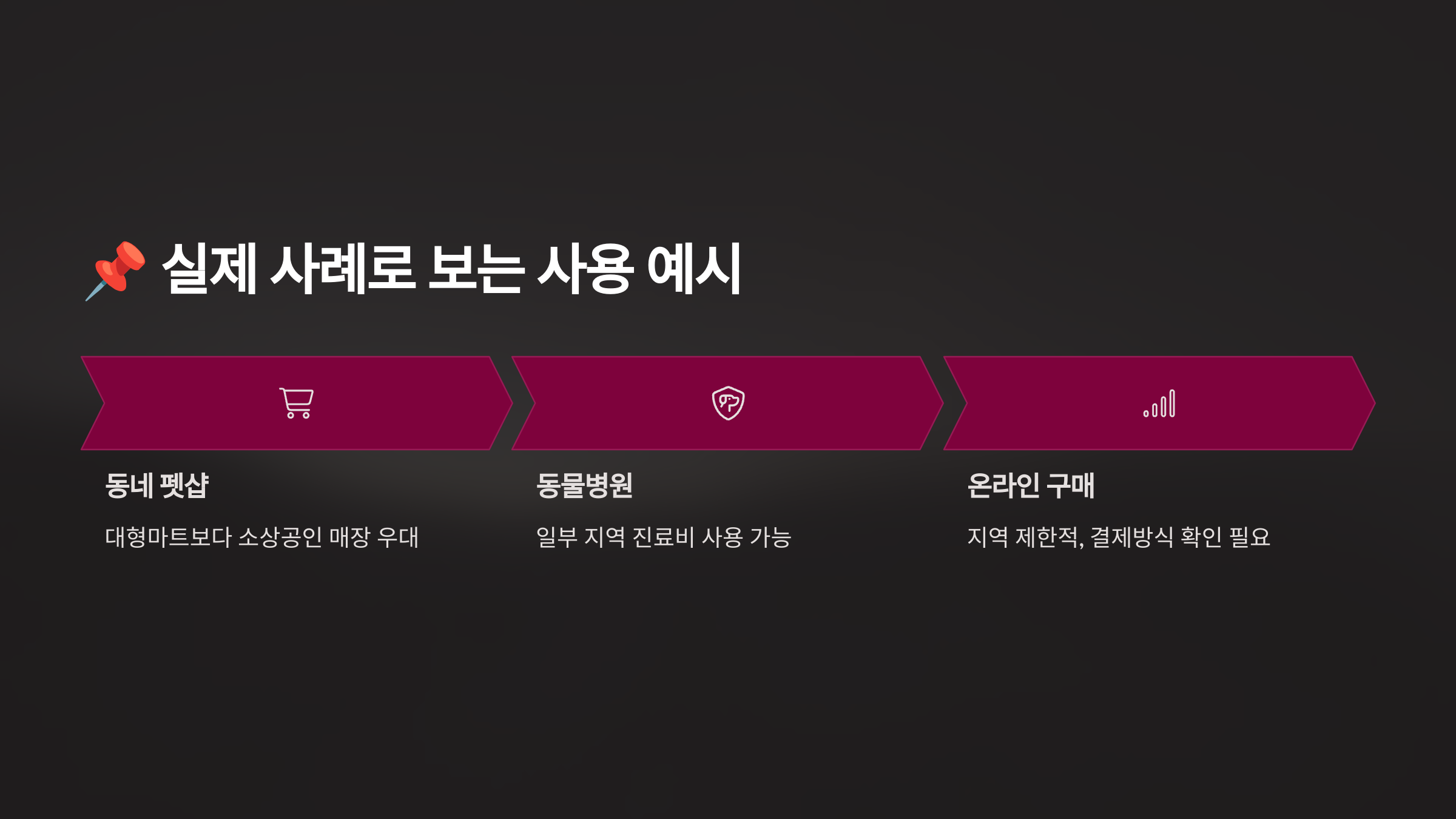 하지만 예외도 있어요. 동물병원, 애견카페, 미용실 등 서비스업으로 등록된 곳은 대부분 결제가 불가능하고, 온라인 쇼핑몰에서도 사용이 제한돼요. 오프라인에서 직접 구매하는 것이 포인트예요.