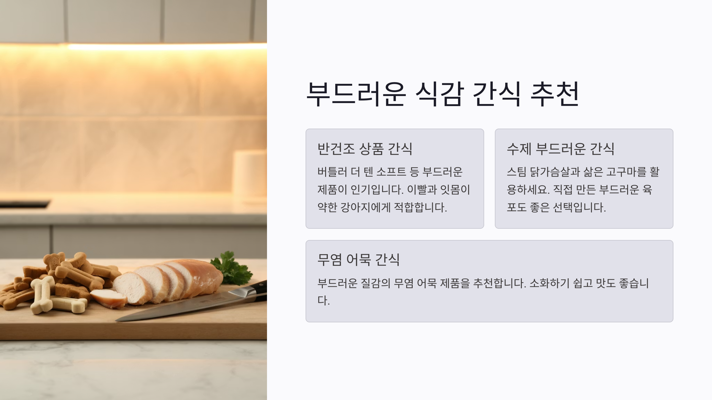 대표적인 부드러운 간식으로는 ‘닭가슴살 슬라이스’, ‘소고기 스팀 간식’, ‘연어무스 스틱’ 등이 있어요. 이들은 식감이 말랑하고 향도 강해 강아지들이 쉽게 반응해요.