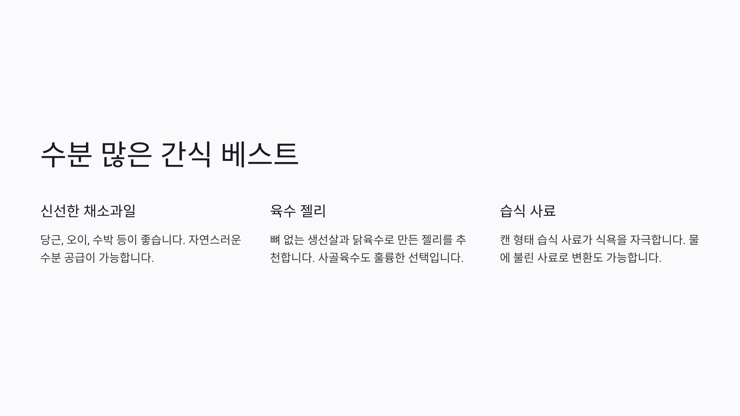 이런 간식은 특히 입맛이 없어 보이는 날에 효과적이에요. 간식 하나로 수분, 영양, 기분까지 챙길 수 있다면 얼마나 좋을까요? 💧
