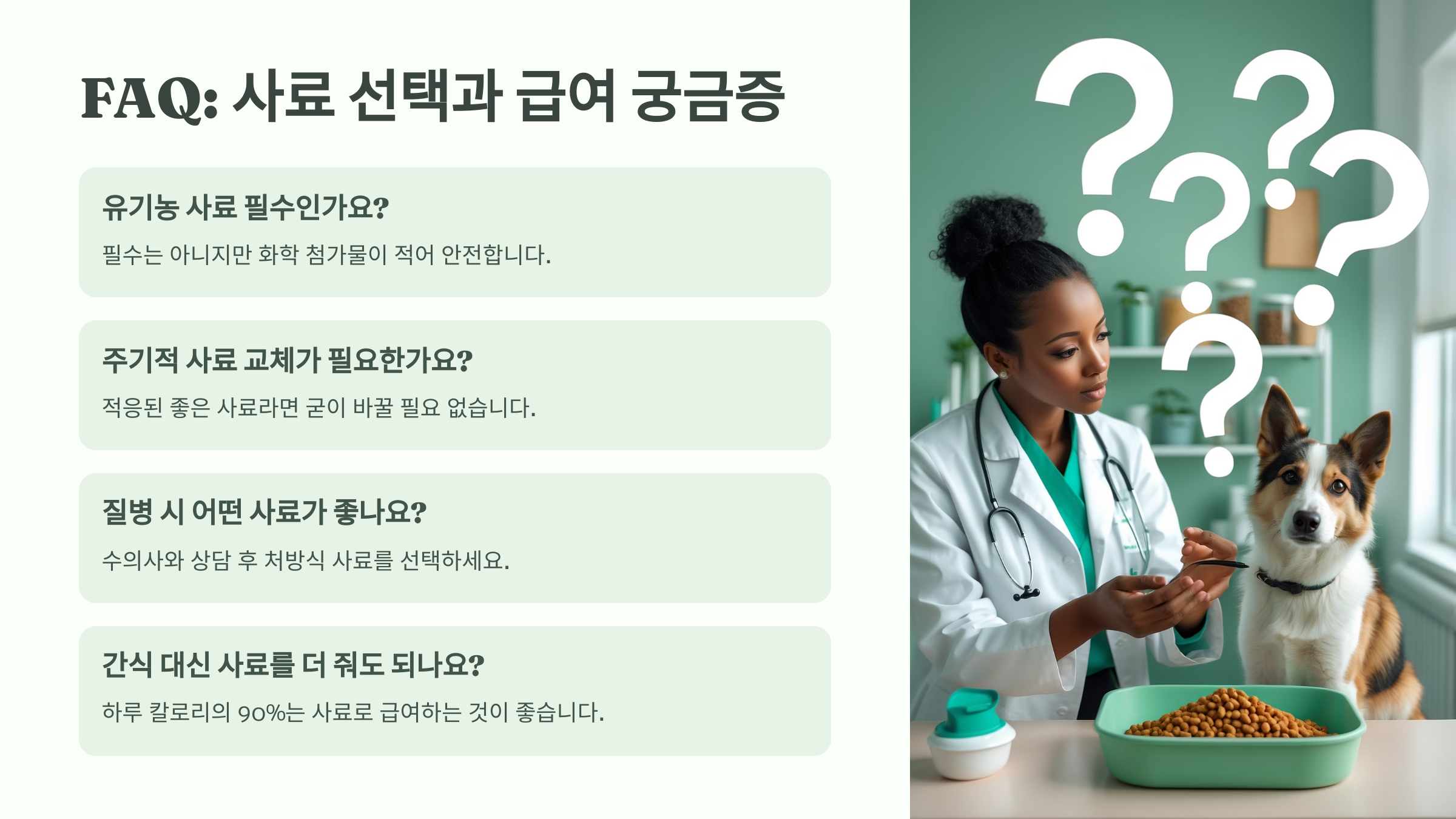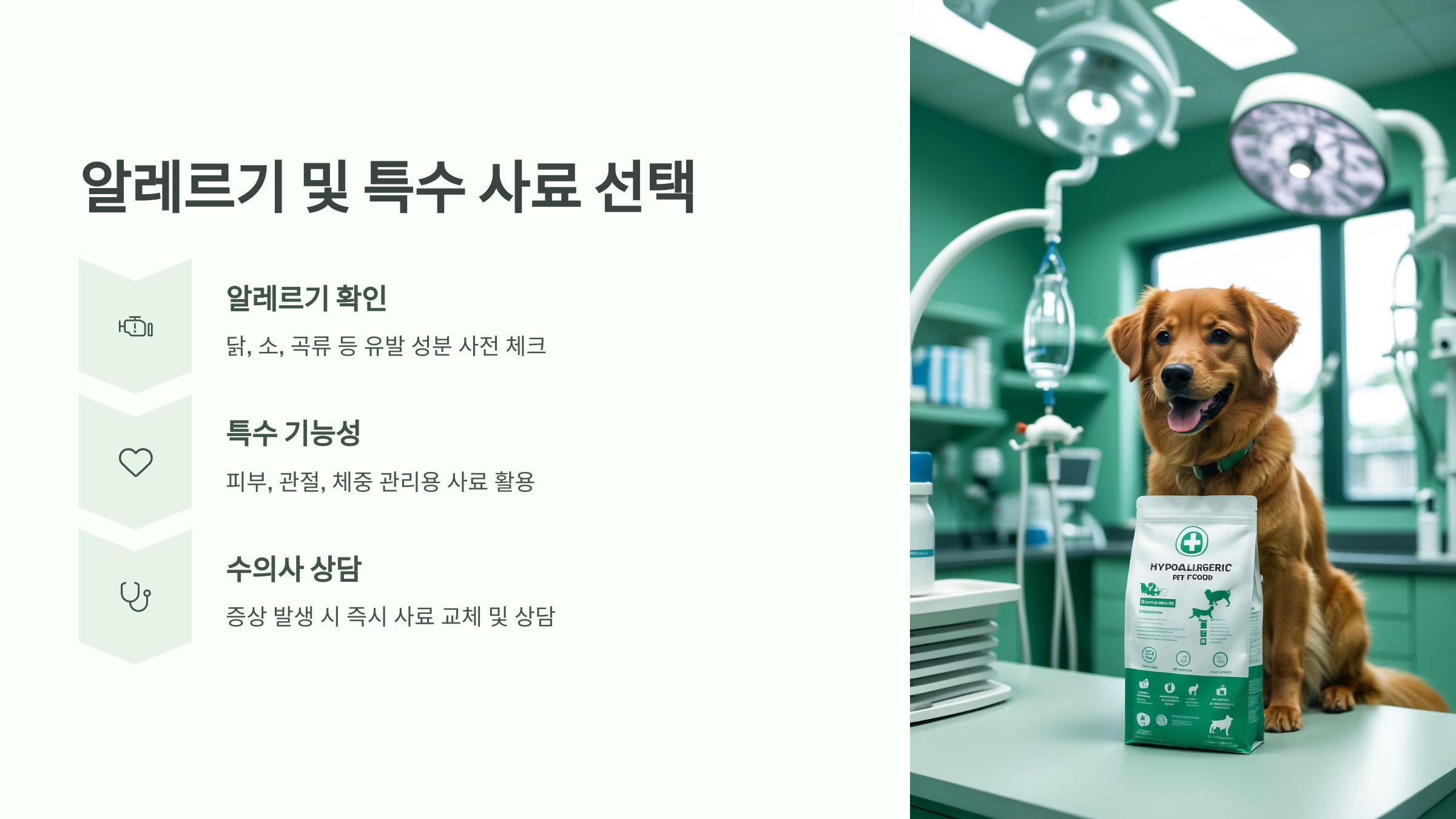 특히 알레르기 사료, 처방식 사료 등 특수 사료로 바꾸는 경우는 더 세심한 주의가 필요해요. 이런 사료는 성분이 특이하기 때문에 천천히 섞는 시간이 더 길어질 수 있어요. 수의사 지시에 따라 전환 일정을 계획하면 실패할 확률이 줄어요.