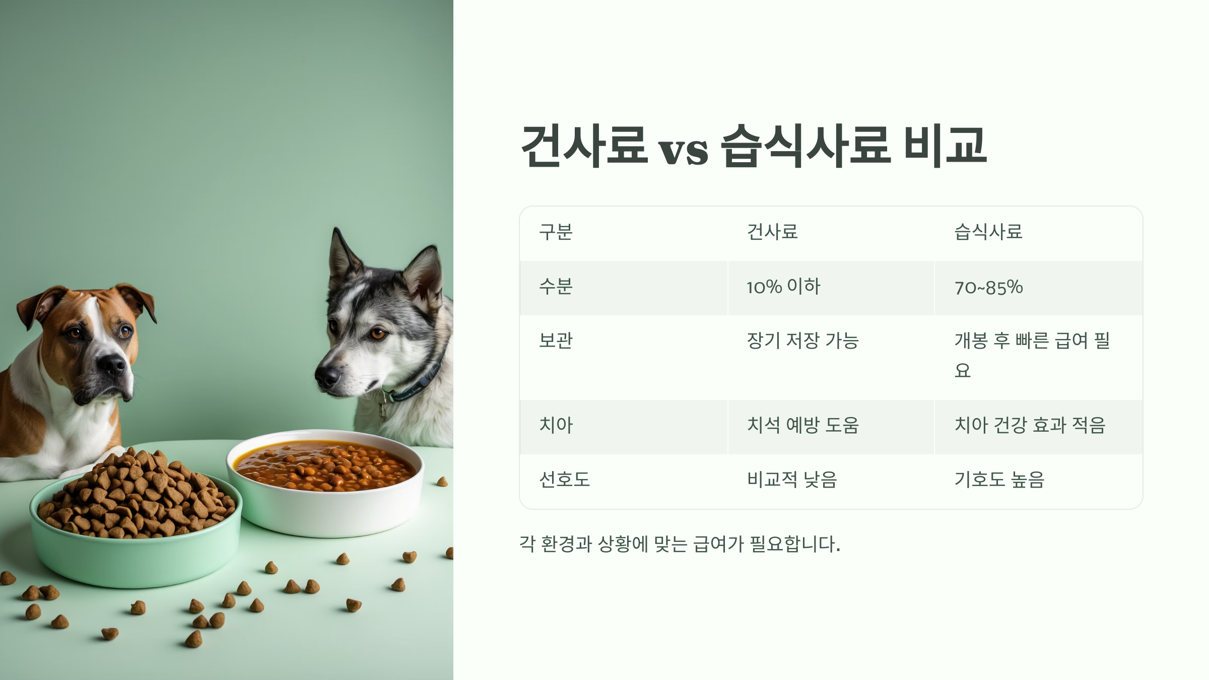 | 건사료 | 보관 용이, 가격 저렴, 치석 예방 | 수분 부족, 입맛 까다로운 아이에게는 거부감 |