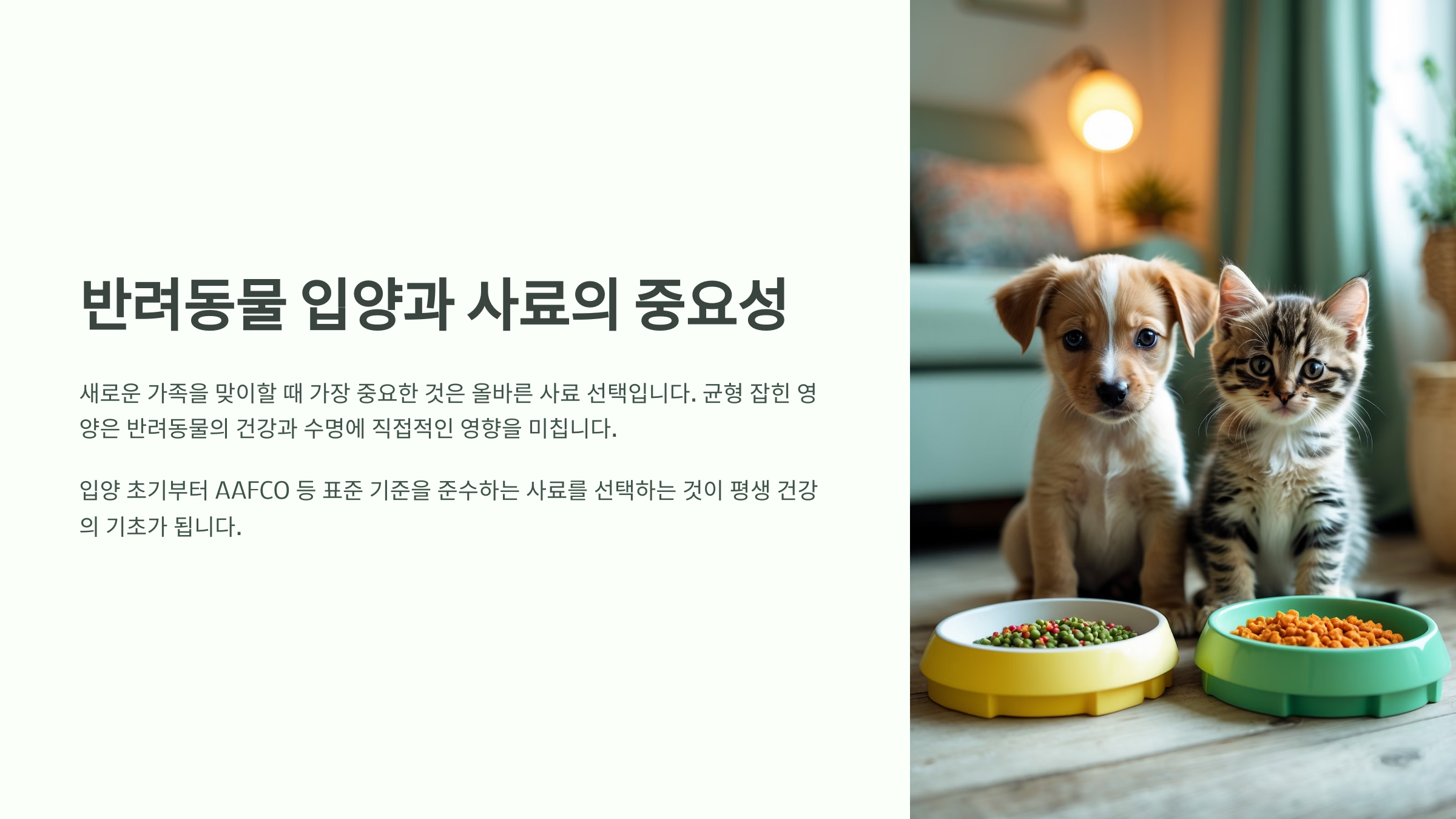 사료는 단순한 음식이 아니라 반려동물의 몸을 구성하고 생명을 유지하는 중요한 영양 공급원이에요. 잘못된 사료 선택은 설사, 알레르기, 체중 증가 또는 면역력 저하로 이어질 수 있어요. 첫 만남에서부터 사료를 잘 고르면 이후 건강관리도 훨씬 수월해진답니다. 😺
