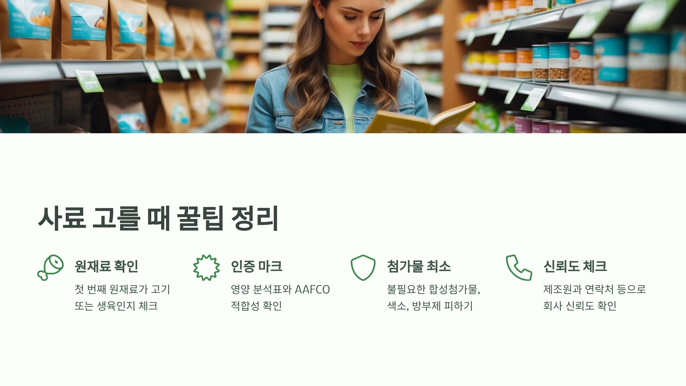 이제까지 사료에 대해 하나씩 알아봤다면, 마지막으로 실제 선택 시 도움이 될만한 꿀팁을 모아볼게요. 정보는 많지만 내 아이에게 맞는 걸 고르는 건 또 다른 이야기니까요. 단순히 유명하거나 가격이 비싼 사료보다 ‘적합성’을 우선으로 보는 게 핵심이에요.