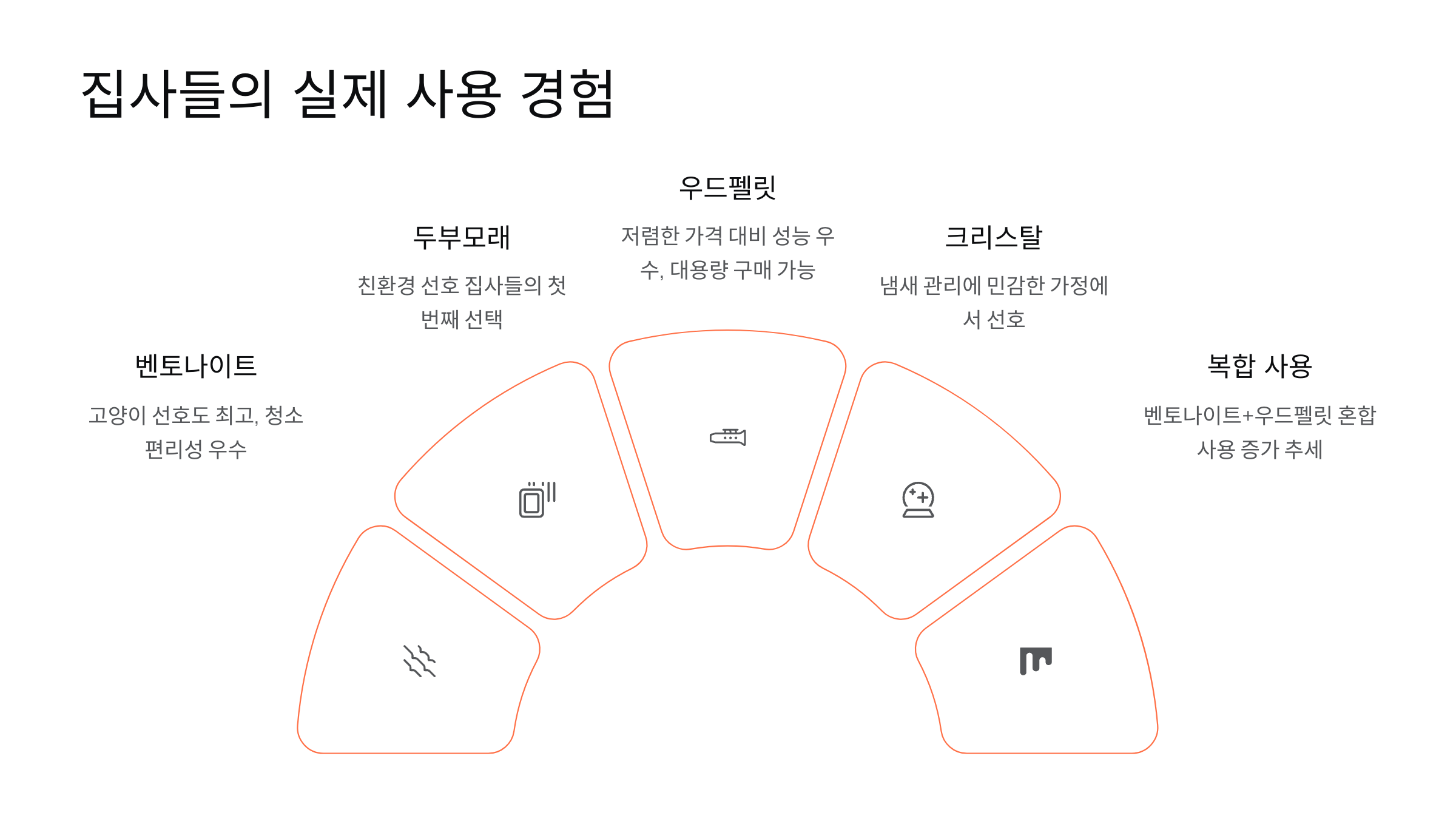 이렇게 고양이 모래는 단순히 '화장실용 모래' 그 이상으로, 고양이와 집사의 라이프스타일에 밀접하게 맞춰지는 진화형 제품이 된 셈이에요.
