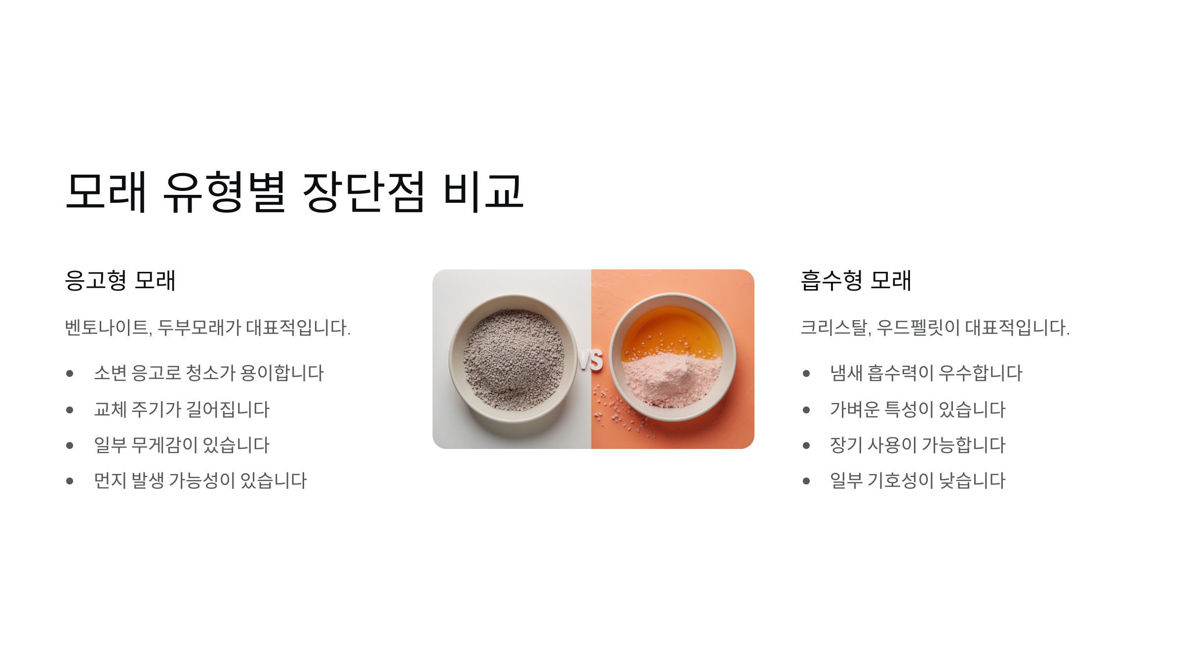 | 두부모래 | 친환경, 변기에 버릴 수 있음 | 습기에 약함, 날림 있음 |