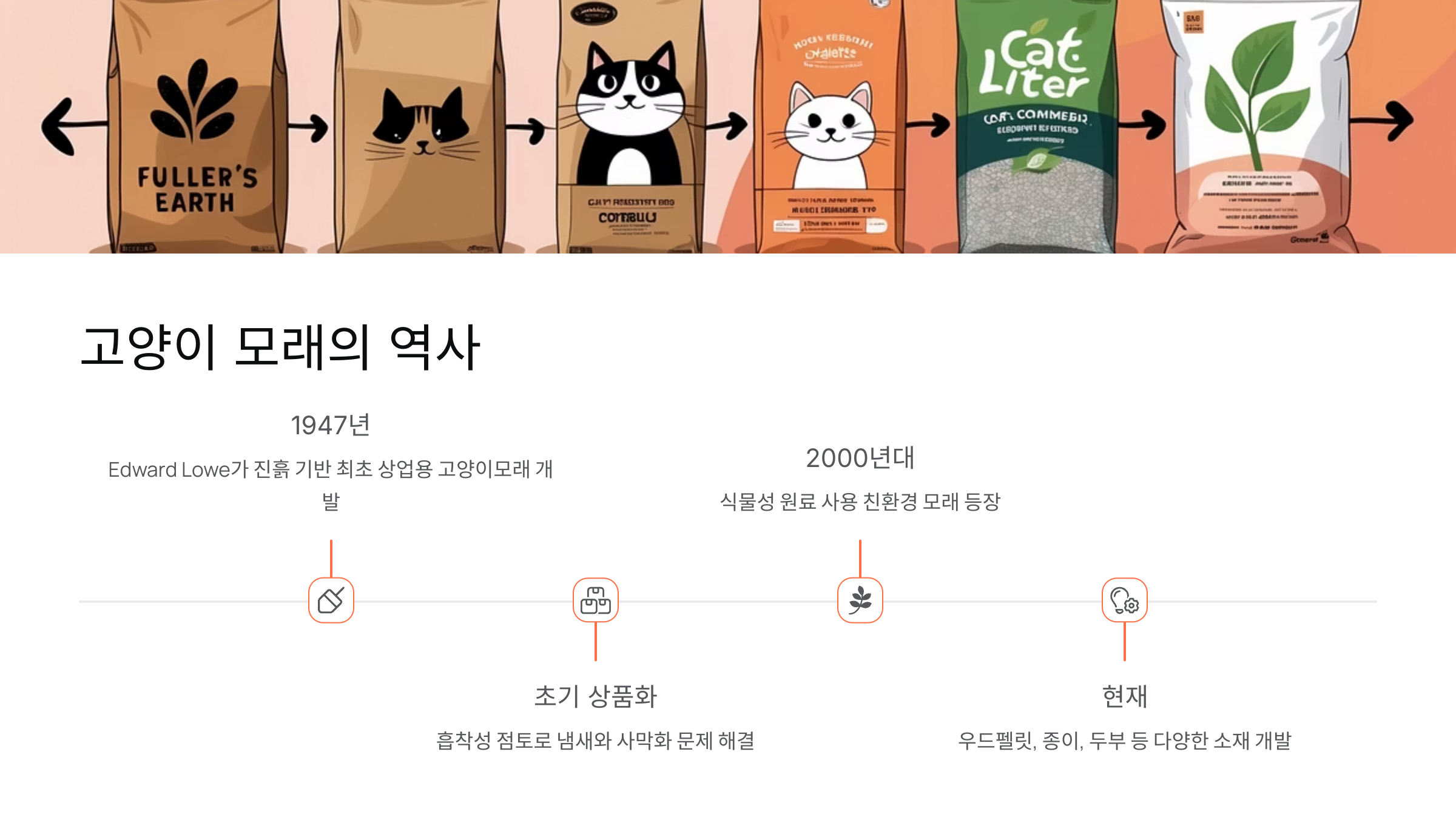 시간이 지나면서 고양이 모래는 벤토나이트 외에도 두부모래, 실리카겔, 옥수수, 커피박 등 다양한 재료로 확장되었고, 각 모래마다 고양이의 성향이나 건강 상태, 집사의 청소 스타일에 맞게 선택할 수 있는 구조로 발전했어요.