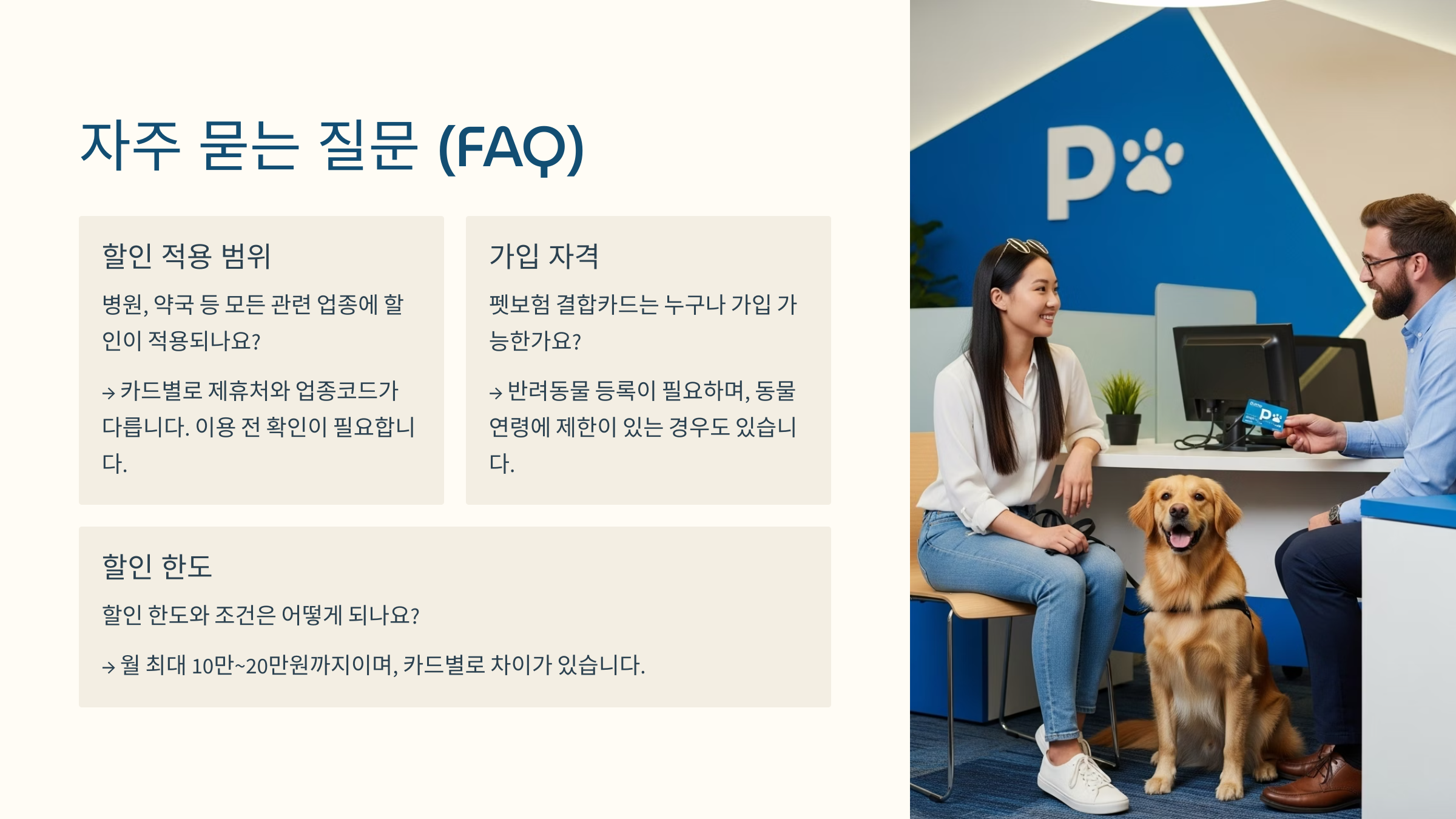 A8. 일반적으로 카드 수령 후 첫 사용부터 바로 적용되지만, 펫보험이나 특정 제휴 혜택은 별도 등록이 필요할 수도 있어요.