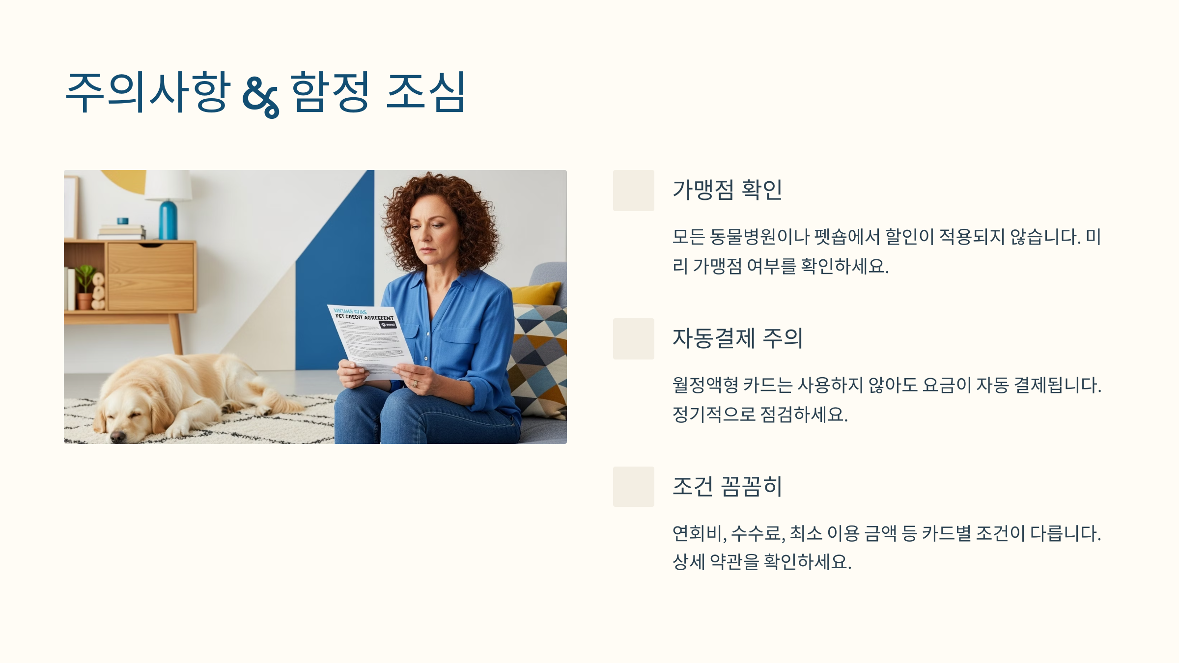 그리고 ‘연회비 대비 혜택 불균형’도 조심해야 해요. 연회비는 1~2만 원 정도지만, 반려동물 관련 사용이 적다면 사실상 혜택을 제대로 못 누리는 거죠. 사용 계획을 미리 세우는 게 중요해요.