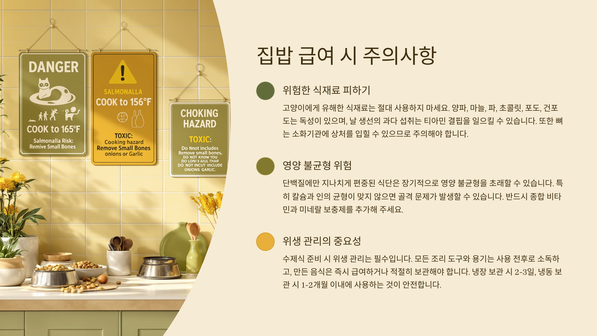 두 번째는 위생이에요. 날고기 사용은 절대 피하고, 익힌 고기를 사용하되 남은 음식은 냉장 보관하고, 2일 이내에 소비해야 해요. 세균 번식은 고양이 장에 큰 위험을 줄 수 있어요.