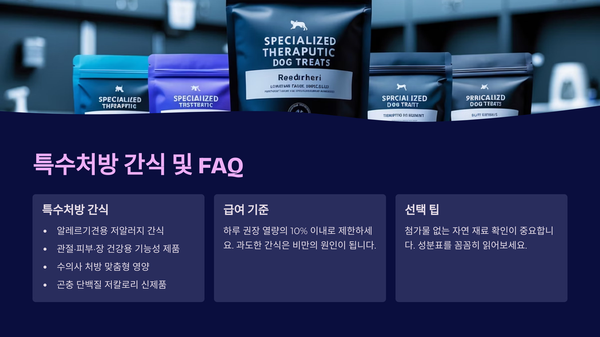 특수 간식은 특정 질환이나 건강 상태를 관리하기 위한 목적으로 만들어졌어요. 수의사 상담 후 선택하는 것이 좋아요.