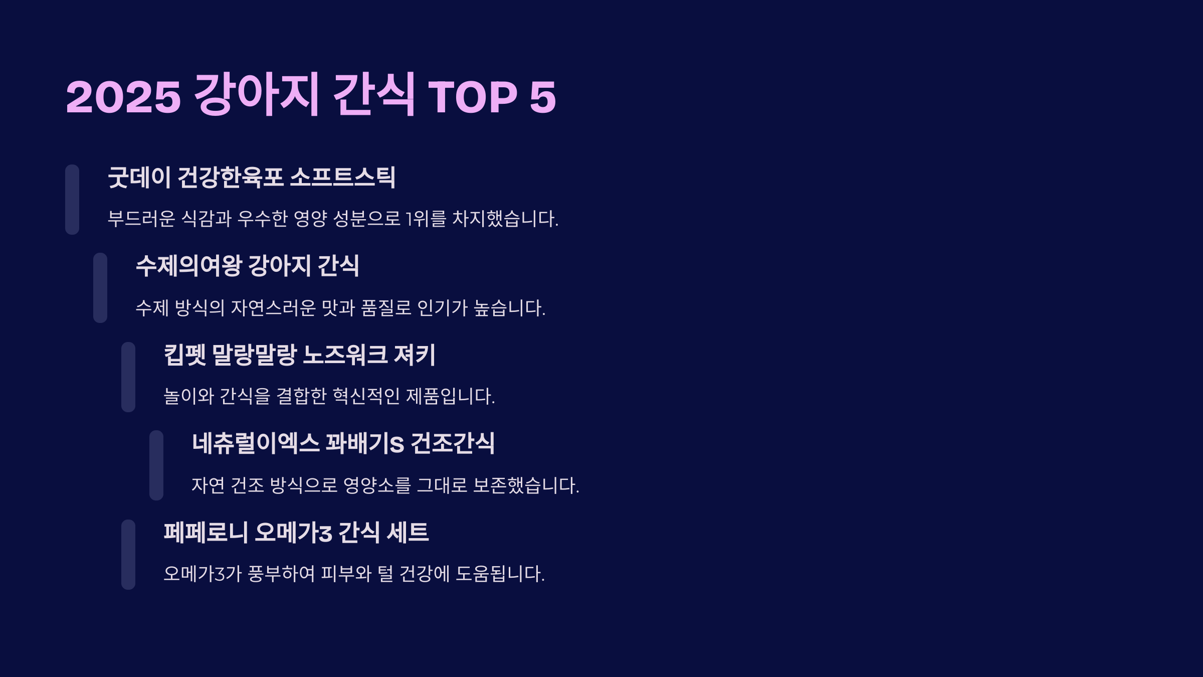 이 기준에 따라 2025년 강아지 간식 추천 리스트가 만들어졌어요. 다음 문단에서는 실제로 수의사들이 추천한 간식 TOP 5를 소개할게요! 🐾
